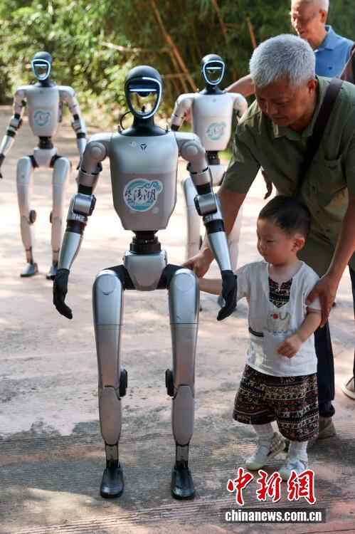 10月6日,江苏南京,“机器人”吸引小朋友。国庆假期,南京汤山紫清湖旅游区上演文旅大戏,“机器人”跳舞、“机器狗”舞狮……精彩纷呈,吸引市民和游客在舒适的环境中快乐度假。
