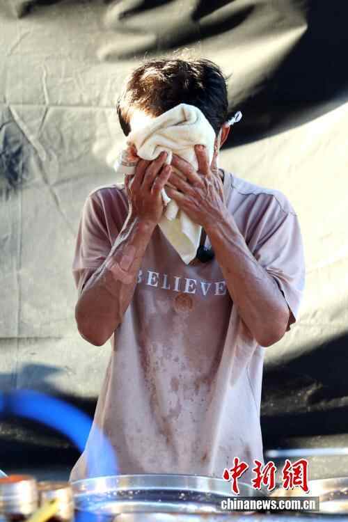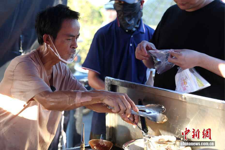 10月6日,江西景德镇,“鸡排哥”李俊永不时用毛巾擦拭脸上的汗水。当天是农历八月十五中秋节,当大多数人与家人团聚时,被网友称为“鸡排哥”的李俊永依然坚守在他的小吃摊前,为全国各地而来的游客制作美食。今年国庆中秋假期,因其在网络走红,他的摊位连日来吸引大批游客,成了当地一道独特的假日景观。