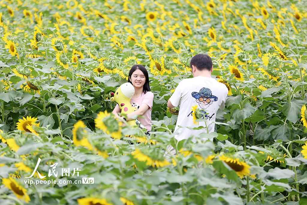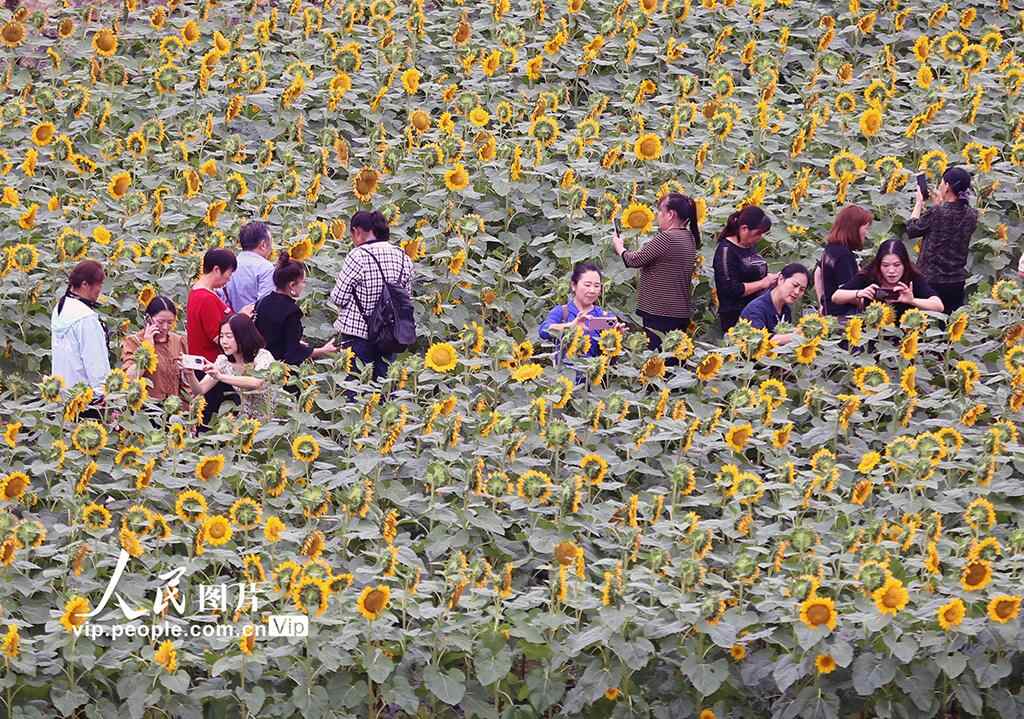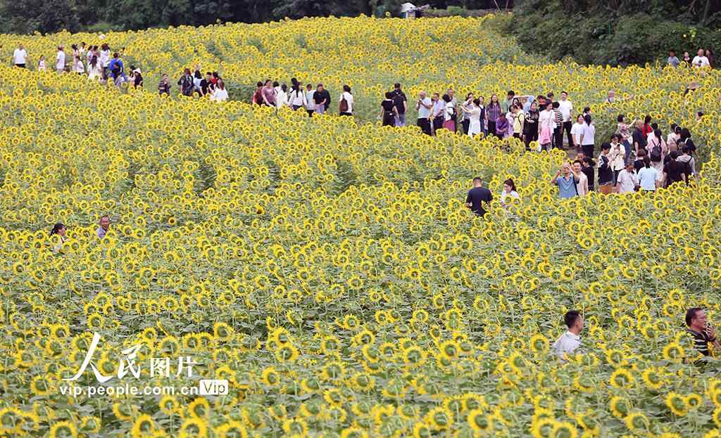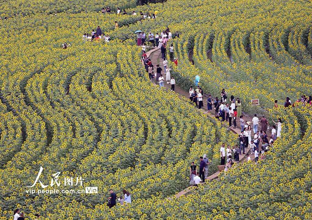 2025年10月5日,四川省峨眉山市峨秀湖畔的向日葵竞相绽放,吸引不少游客前来赏花。李华时摄(人民图片网)