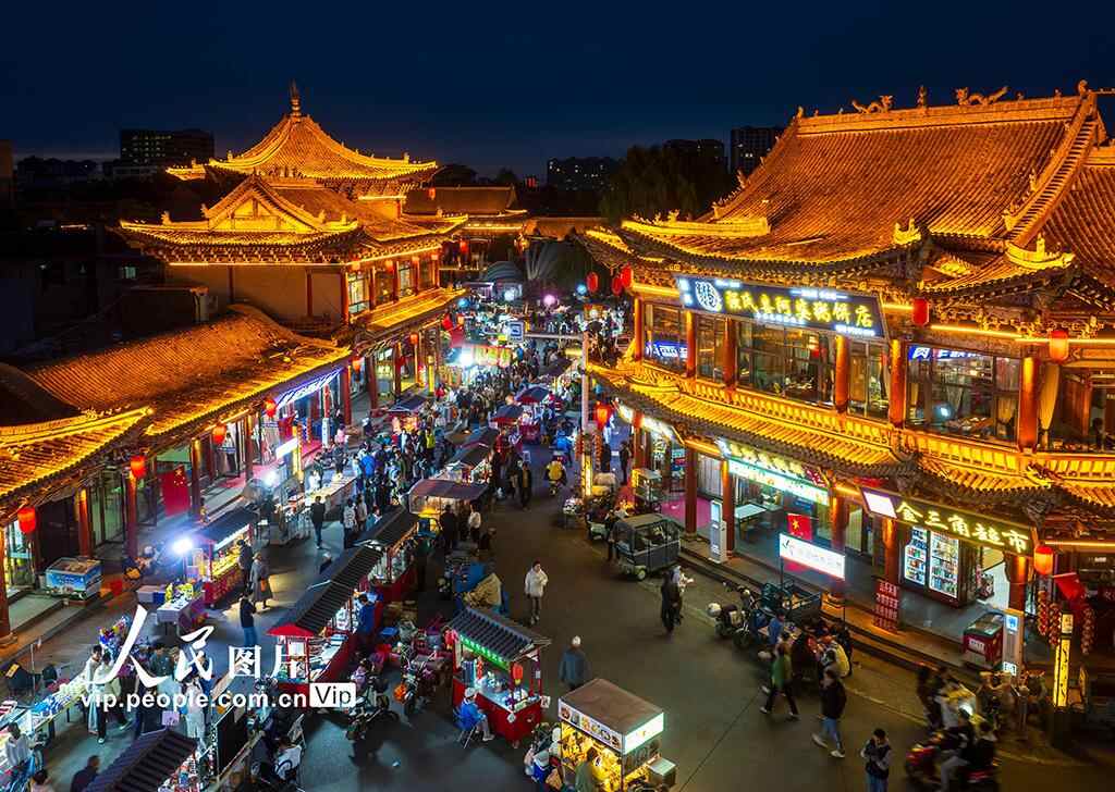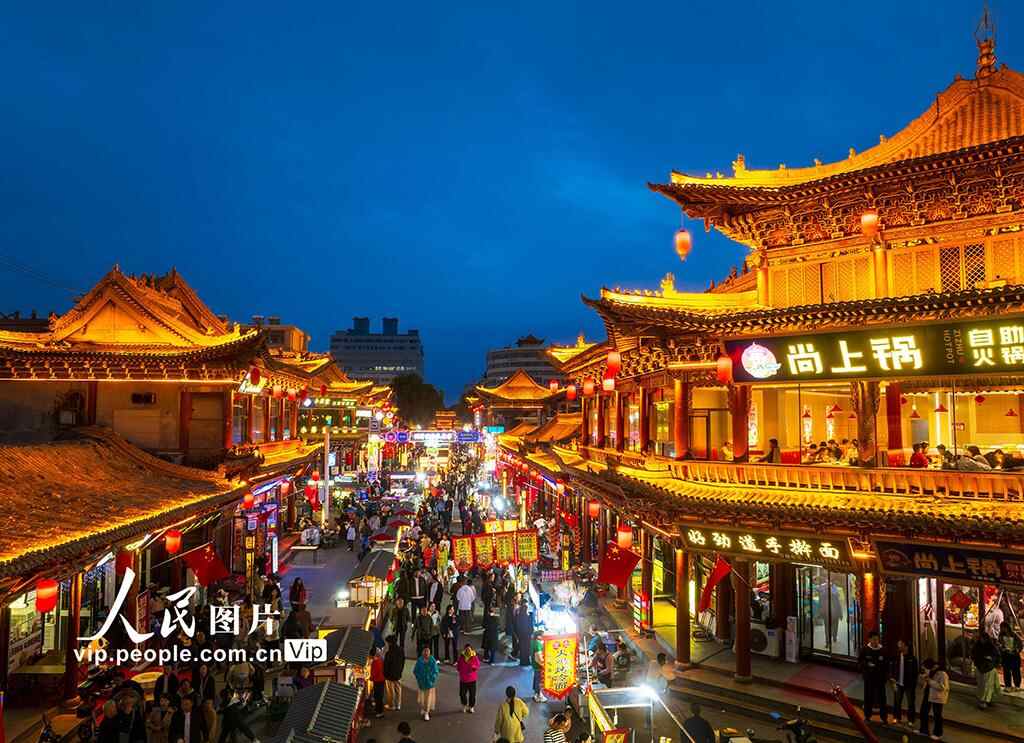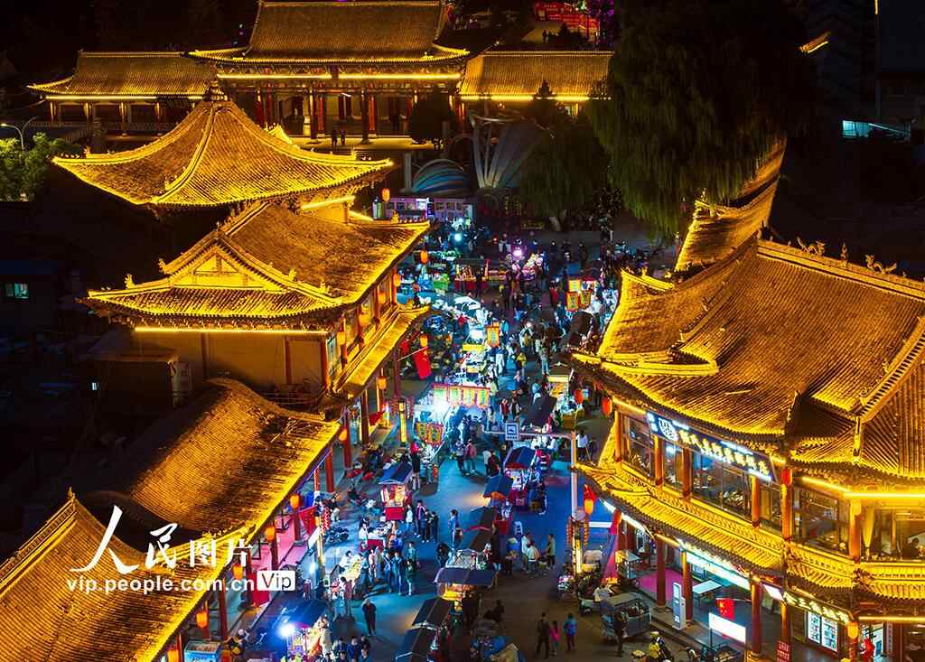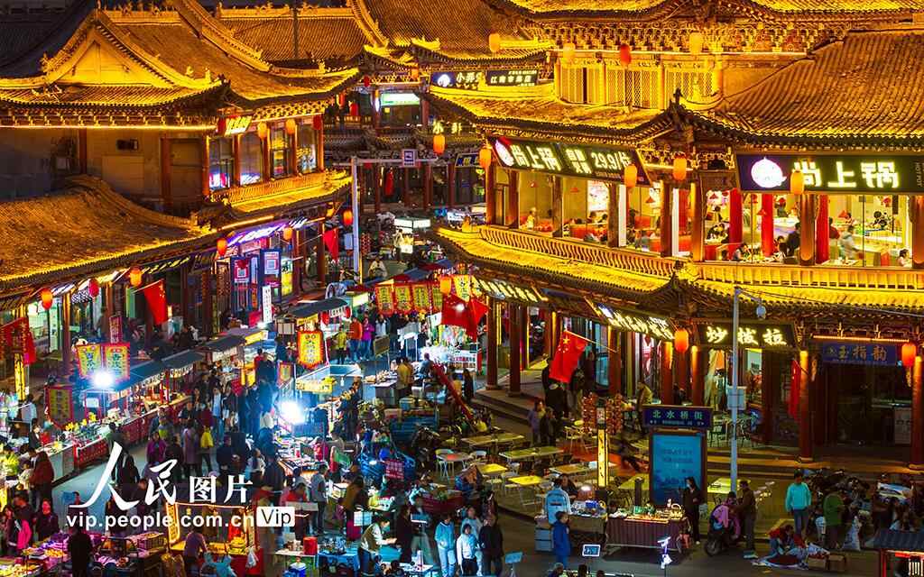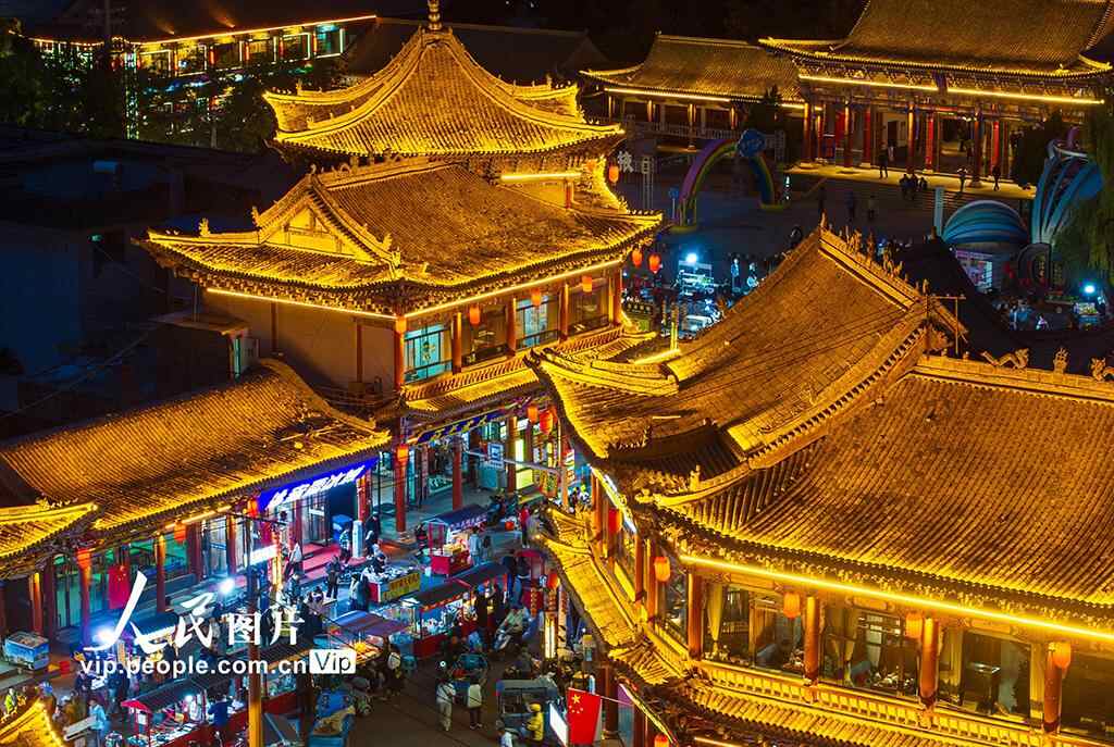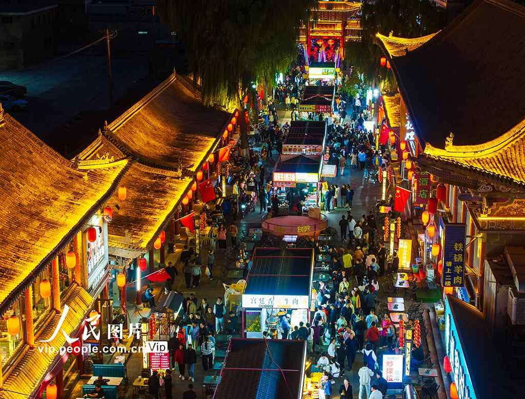 2025年10月5日,甘肃省张掖市甘州区明清老街夜景璀璨,人潮涌动,“夜经济”红红火火。杨潇摄(人民图片网)