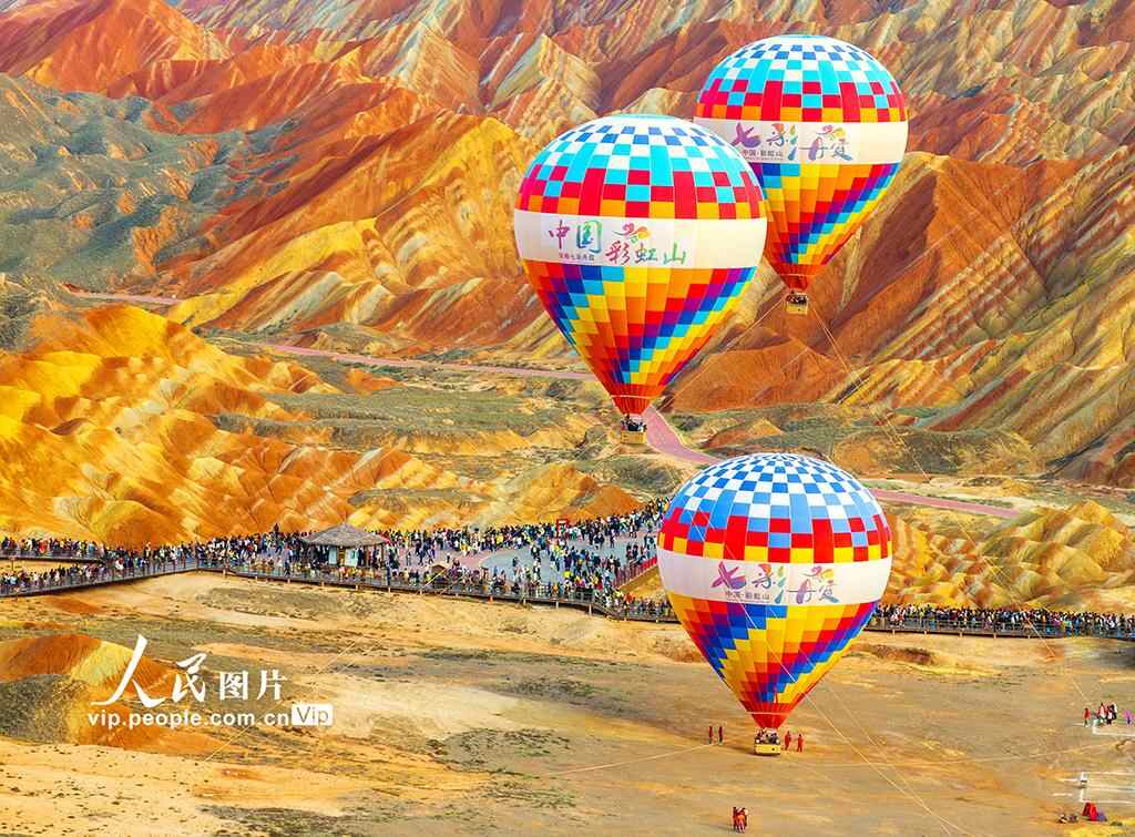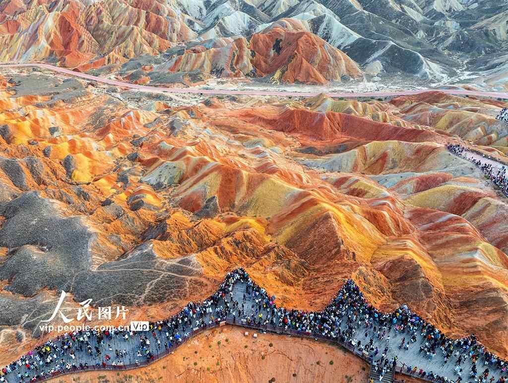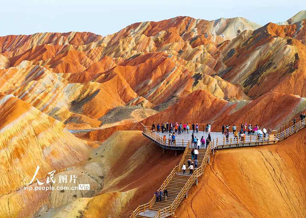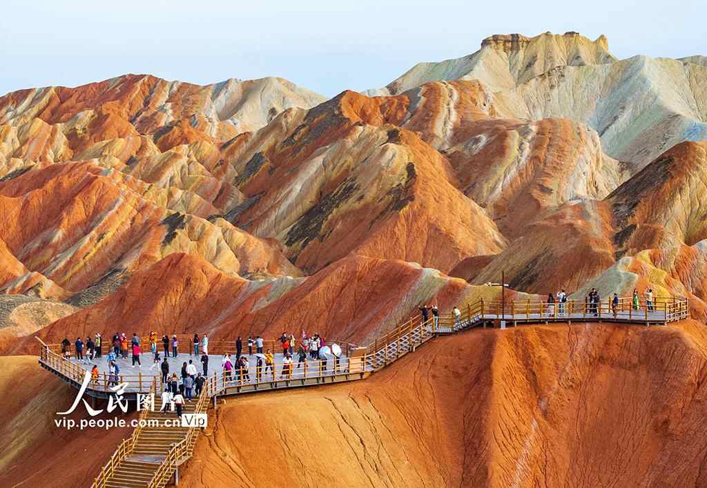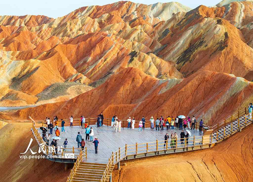 2025年10月5日,游客在甘肃省张掖七彩丹霞景区观光游览。杨潇摄(人民图片网)