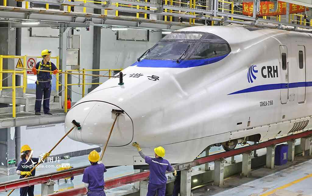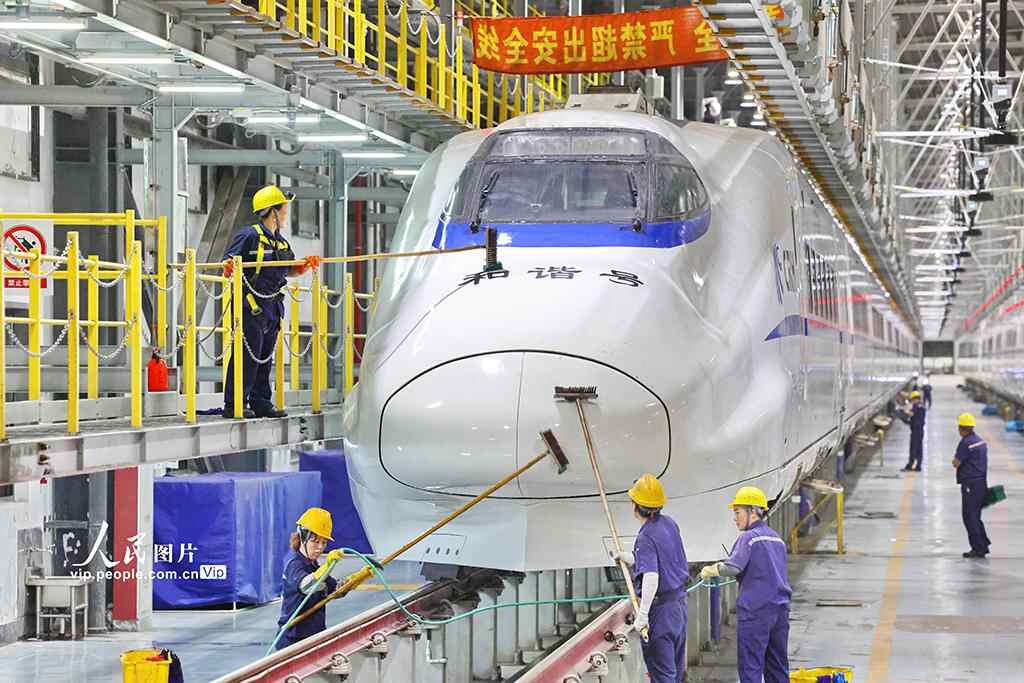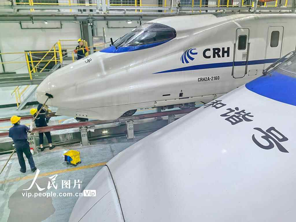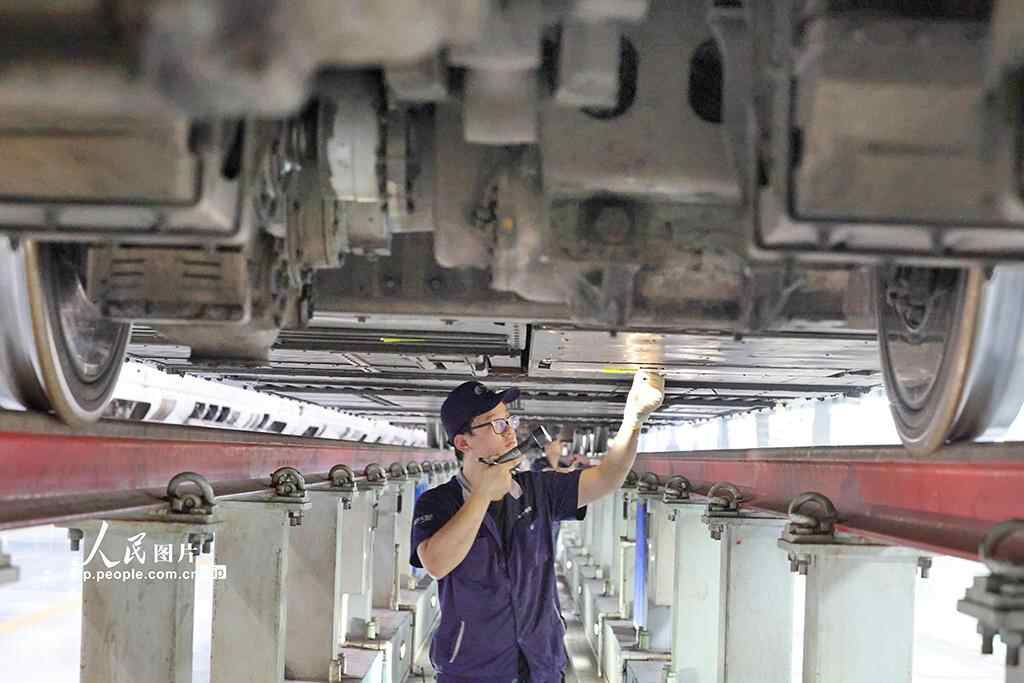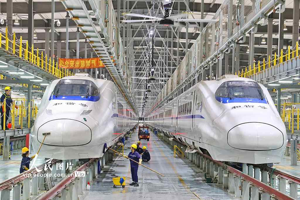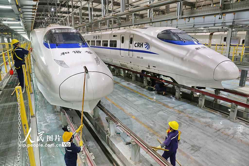 为保障国庆中秋假期铁路运输,南通动车所检修数量、过夜存放车组数等均有所增加。许丛军摄(人民图片网)