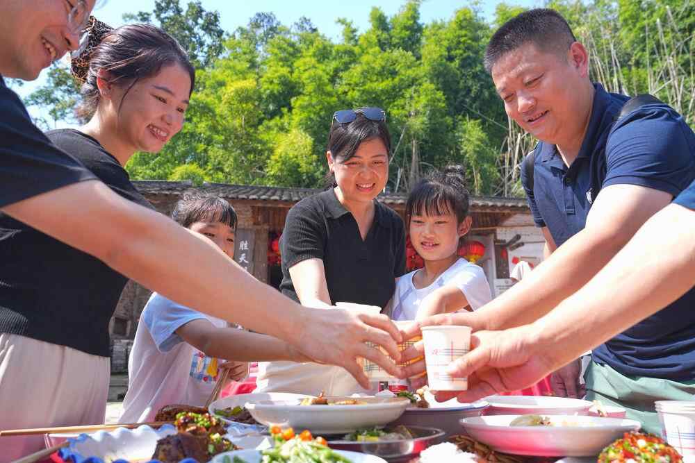 10月6日,在重庆市北碚区金刀峡镇胜天湖村“九斗碗坝坝席”现场,游客举杯共庆中秋佳节。新华社发(秦廷富摄)