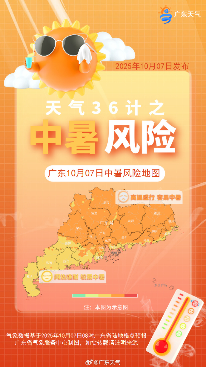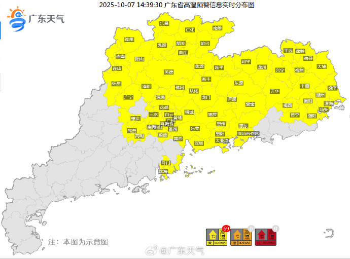国庆假期广东火热收尾,晴热模式开启!据 @广东天气 截止至10月7日14时,广州、深圳等地69个市县高温黄色预警生效中。未来几天广东大部受副热带高压控制,大部晴热天气为主,最高气温普遍介于33~36℃之间,体感炎热,森林火险气象风险升高,需注意用火安全。