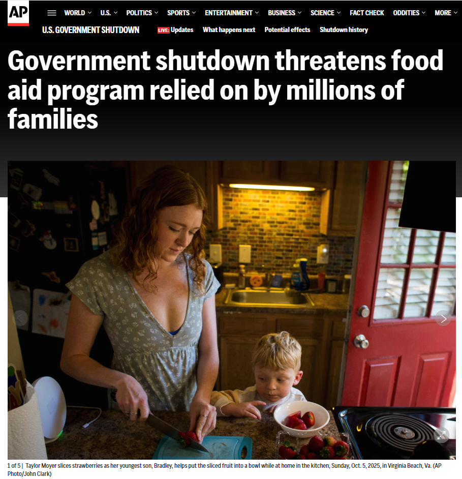 美联社在一篇有关低收入母亲和幼儿的食品援助计划的报道中说,政府持续“关门”将会影响到这一项帮助 600 多万低收入母亲和幼儿的食品援助计划的实施。