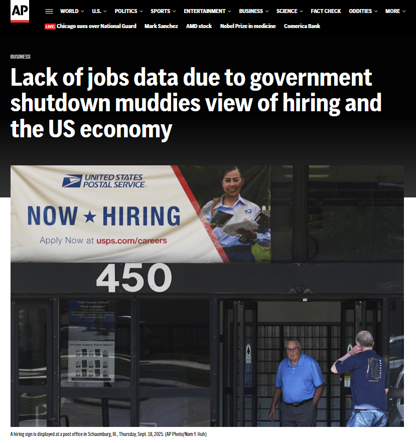 报道说,此外,如果政府“关门”持续一周或更长时间,还可能推迟发布其他重要数据,包括原定于 10 月 15 日发布的下一份通胀报告。有专业人士表示,目前服务业的通胀有所回升,表明通胀可能正在蔓延至进口产品以外的领域。因此,下一份通胀报告的发布很重要。如果这份报告也被推迟的话,“这会让政府关门和劳工统计局数据的缺失更加令人担忧”。