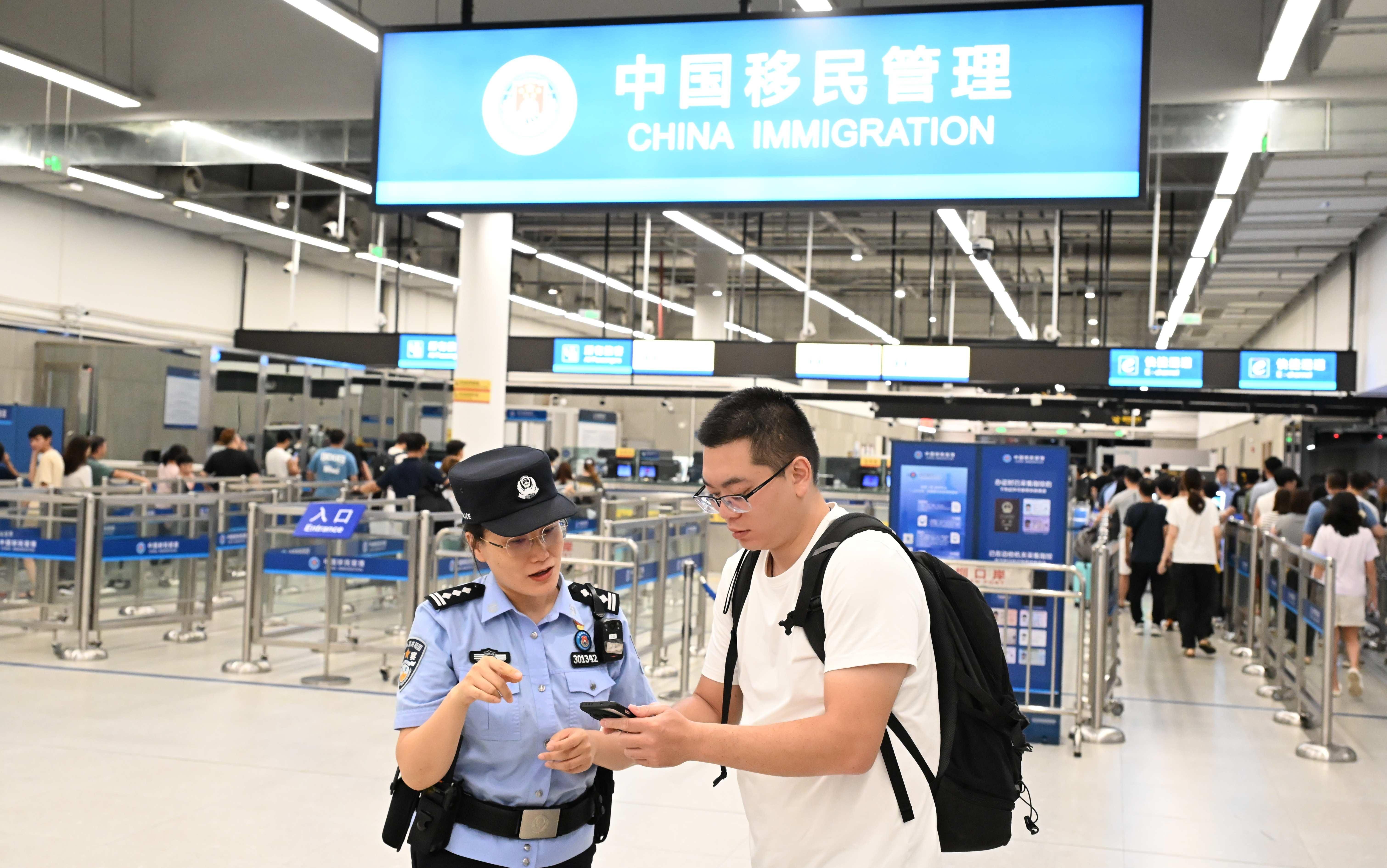 就在昂旺措姆提笔写信的同时,皇岗口岸临时旅检场地的出境大厅里,江琛蕾正身着藏蓝色警服,在“中国移民管理”标识牌下专注地核验旅客信息。身后是川流不息的通关人群,金属栏杆分隔出的通道延伸向远方。这是移民管理警察专业高效服务的常态,也是这场跨越千里对话的起点。