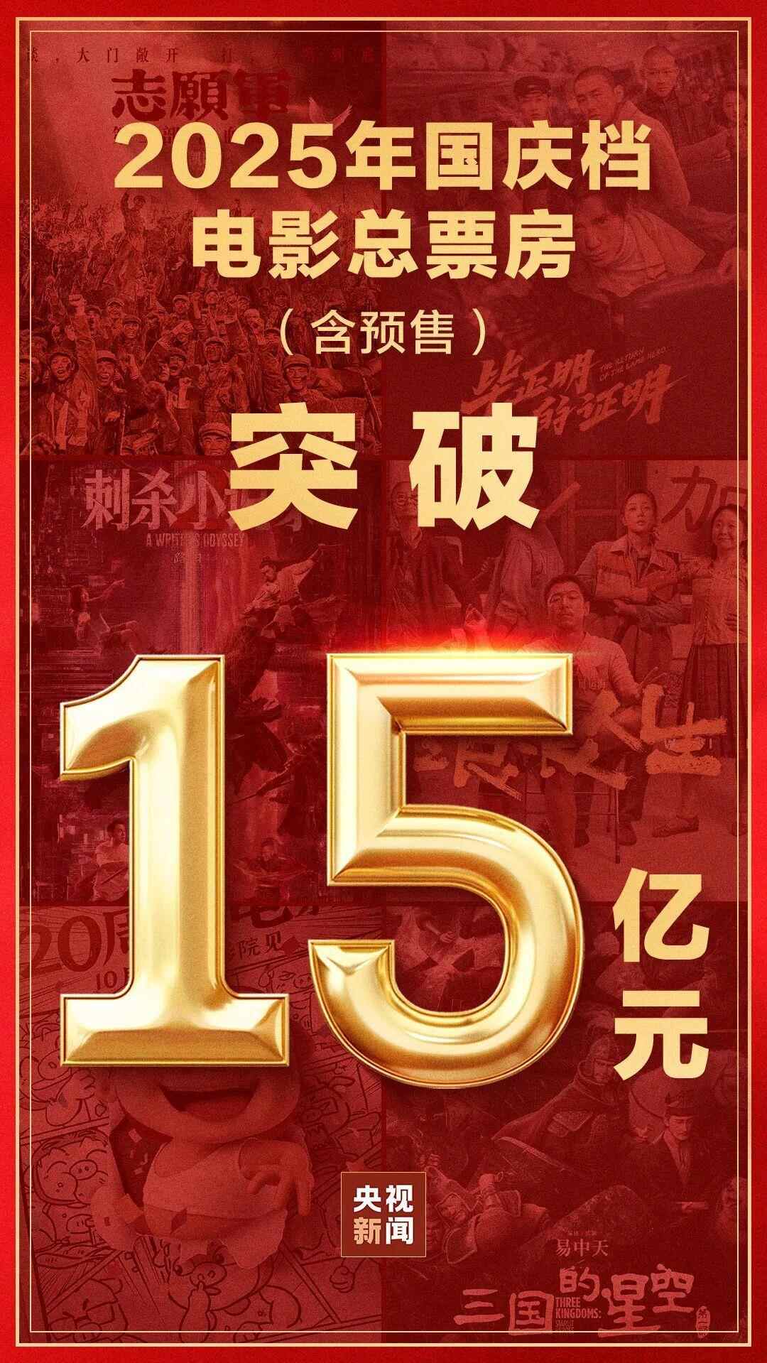 截至10月6日17时28分,2025年国庆档档期总票房(含预售)已突破15亿元。国庆与中秋双节叠加的8天假期,类型多样的电影佳作扎堆上映为家庭观影提供了更多选择,使国庆档电影票房表现亮眼。