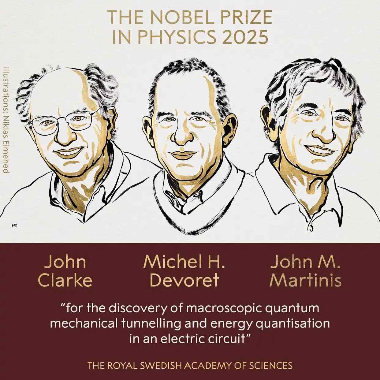 瑞典皇家科学院7日宣布,决定将2025年诺贝尔物理学奖授予科学家约翰·克拉克、麦克·H·德沃雷特、约翰·M·马蒂尼,以表彰他们“发现电路中的宏观量子力学隧道效应和能量量子化”。