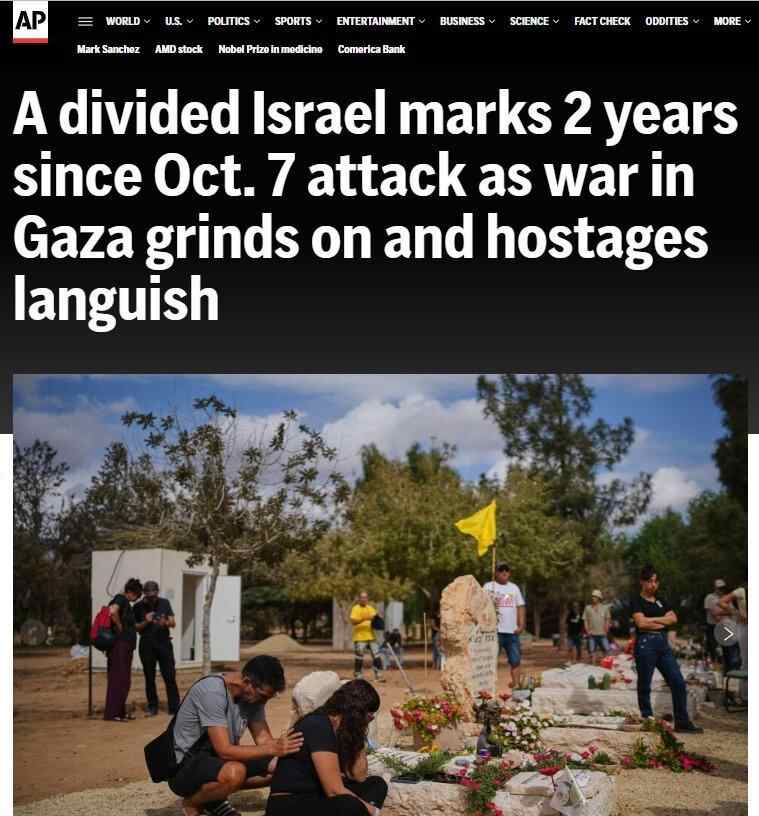 美联社7日发布的一篇报道关注了两年来加沙的冲突仍在持续,被扣押人员还在挣扎,与此同时以色列内部正在分裂。报道称,10月7日以色列人准备悼念遇难者,然而主要的悼念仪式是由遇难者家属组织的,而不是以色列政府。这反映出人们对内塔尼亚胡政府存在深刻分歧,许多人认为迟迟未能达成停火协议救回被扣押人员的主要责任方就是内塔尼亚胡。