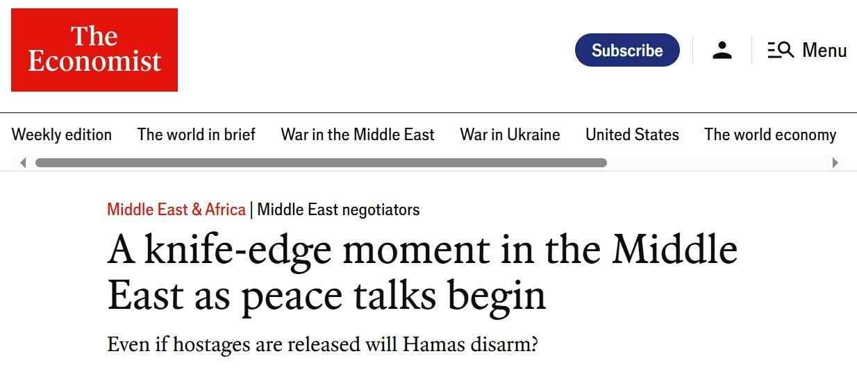 英国的《经济学人》6日的报道关注了冲突两年之际以色列与哈马斯正就美国总统特朗普的加沙“20点计划”进行谈判。报道认为,中东和平迎来关键时刻,双方可能都希望缩小分歧,至少就该计划的第一阶段达成一致,即先行停火、交换被扣押人员并向加沙地带提供人道主义援助。但后续真正停火的核心分歧之一仍难破解,那就是哈马斯解除武装的问题。