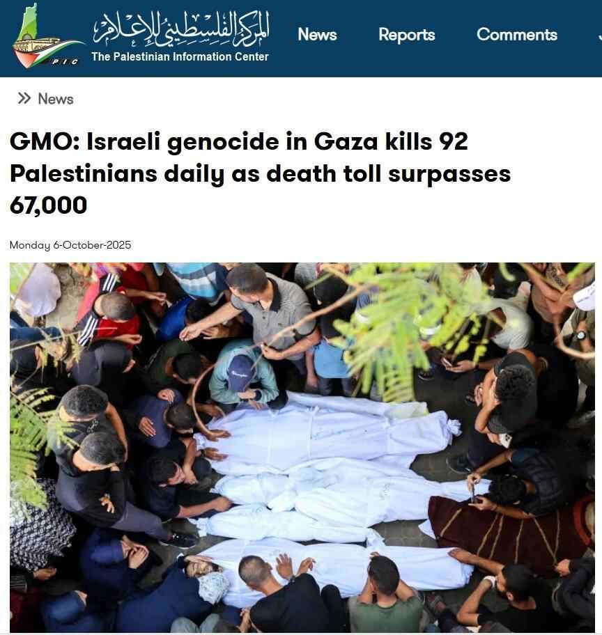 巴勒斯坦信息中心(PIC)新闻网站6日援引政府部门的报告,发表加沙地带巴勒斯坦人两年内的伤亡情况。报道称,以色列自2023年10月7日开始的猛攻已造成67160人死亡和近17万人受伤。自“种族灭绝”开始以来,以军平均每天杀害92名巴勒斯坦人。