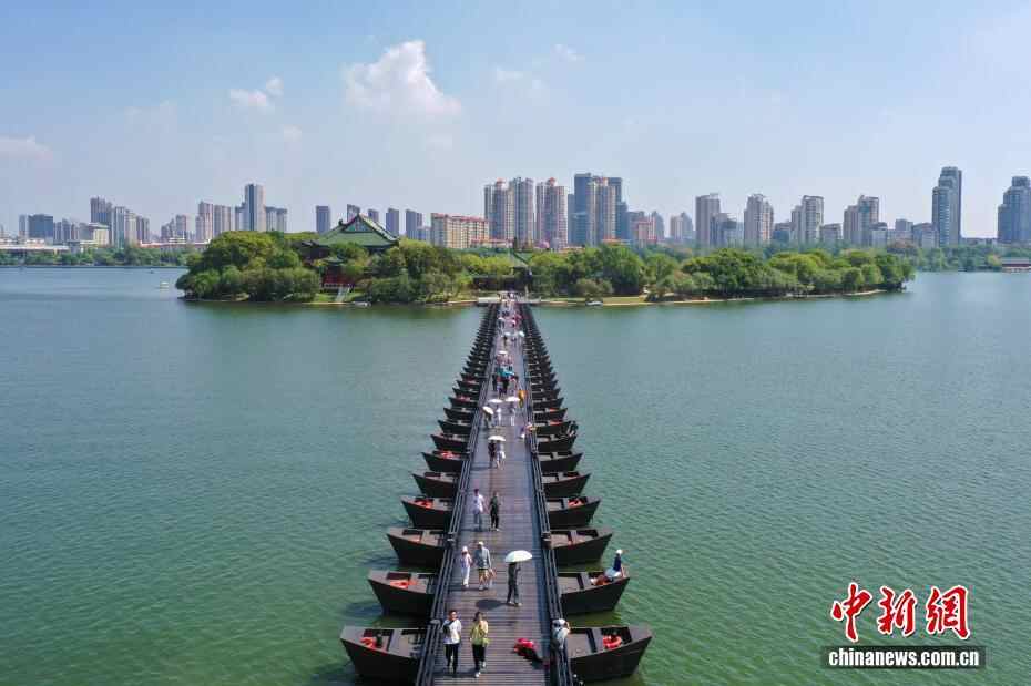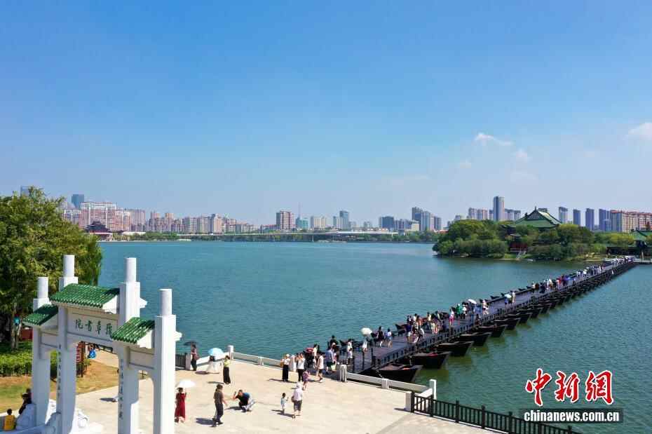10月5日,游客经过水上游览步道“书院桥”走进南昌文旅新地标——豫章书院参观。坐落于南昌市象湖湖心岛的豫章书院始建于南宋,一座全长202.8米的浮桥与湖岸相连。岛上水绿相映、绿树成荫,环境清幽。国庆中秋假期,碧瓦丹柱、斗拱重檐的仿古建筑吸引了众多游客前来游览。(无人机照片)
