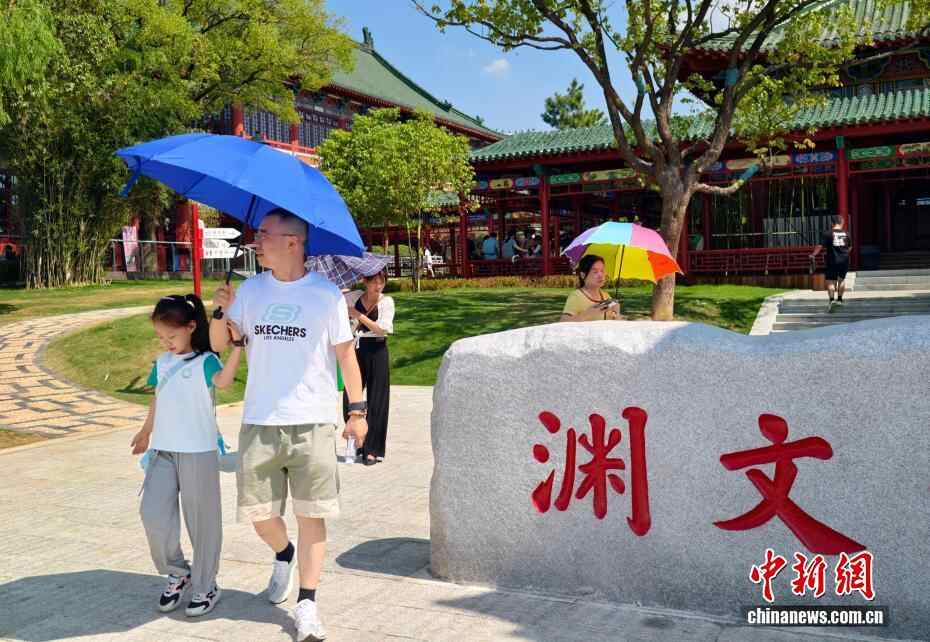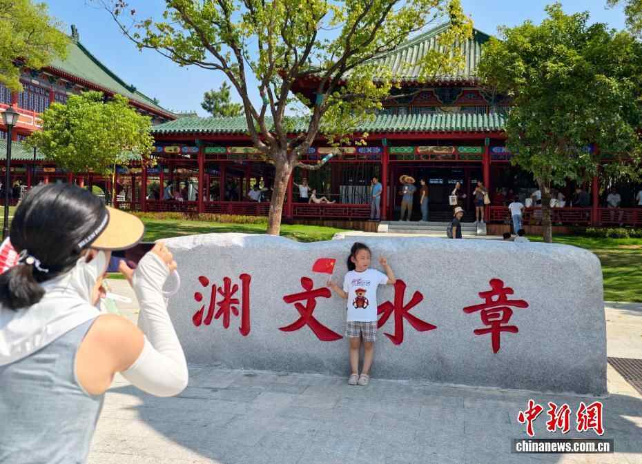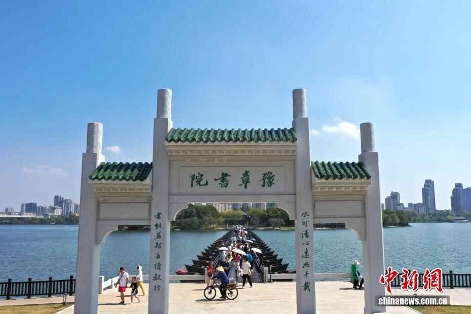 10月5日,游客走进南昌文旅新地标——豫章书院参观。坐落于南昌市象湖湖心岛的豫章书院始建于南宋,一座全长202.8米的浮桥与湖岸相连。岛上水绿相映、绿树成荫,环境清幽。国庆中秋假期,碧瓦丹柱、斗拱重檐的仿古建筑吸引了众多游客前来游览。