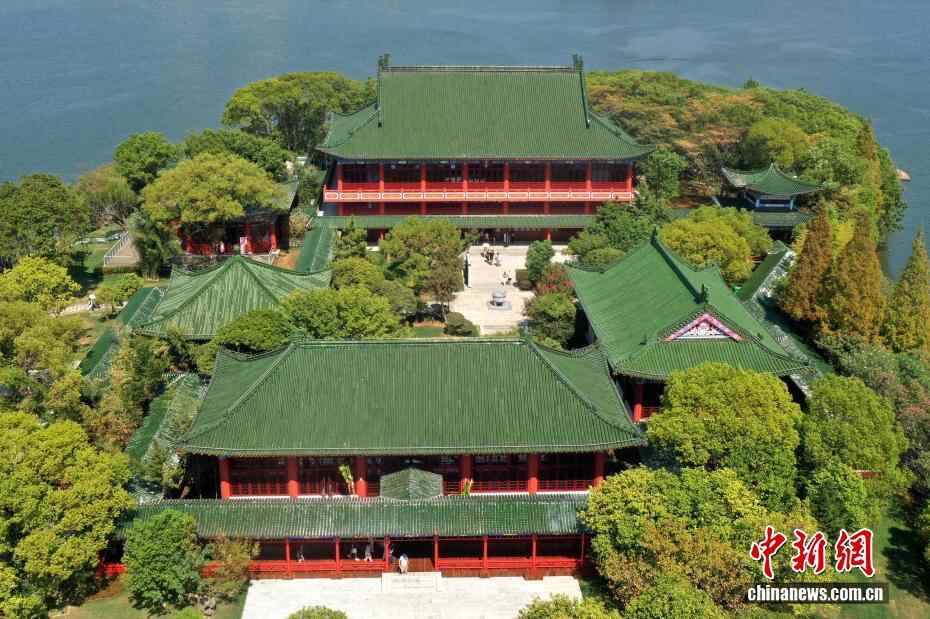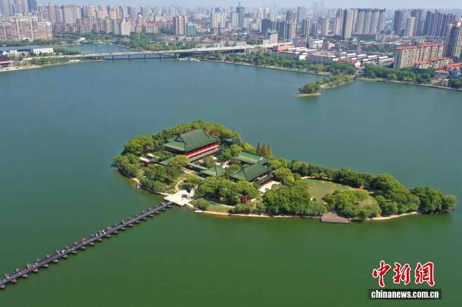 10月5日,航拍下的南昌文旅新地标——豫章书院。坐落于南昌市象湖湖心岛的豫章书院始建于南宋,一座全长202.8米的浮桥与湖岸相连。岛上水绿相映、绿树成荫,环境清幽。国庆中秋假期,碧瓦丹柱、斗拱重檐的仿古建筑吸引了众多游客前来游览。(无人机照片)