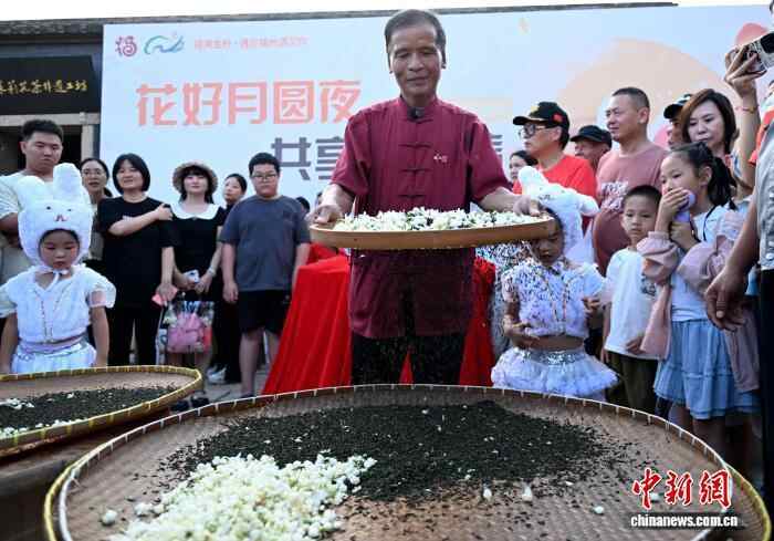 10月5日,“花好月圆夜 共享邻里情”中秋民俗活动在福州市仓山区梁厝特色历史文化街区举办。活动现场文艺表演、猜灯谜、摆塔、月饼分享、拜月仪式等环节轮番上演,为市民、游客带来了一场沉浸式的中秋文化盛宴。图为市民、游客观看茉莉花茶窨制工艺演示。中新社记者 吕明 摄