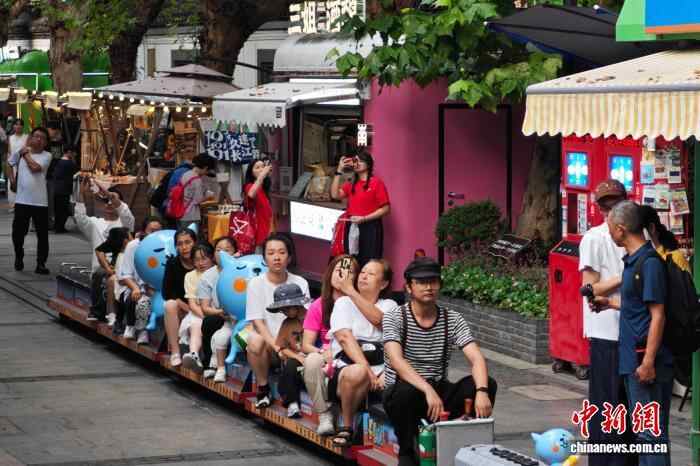 10月5日,江苏南京,游客们在长江路1912街区乘坐小火车游览。据南京智慧旅游大数据监测平台显示,假期前五天,该市累计接待游客1406.4万人次。中新社记者 泱波 摄