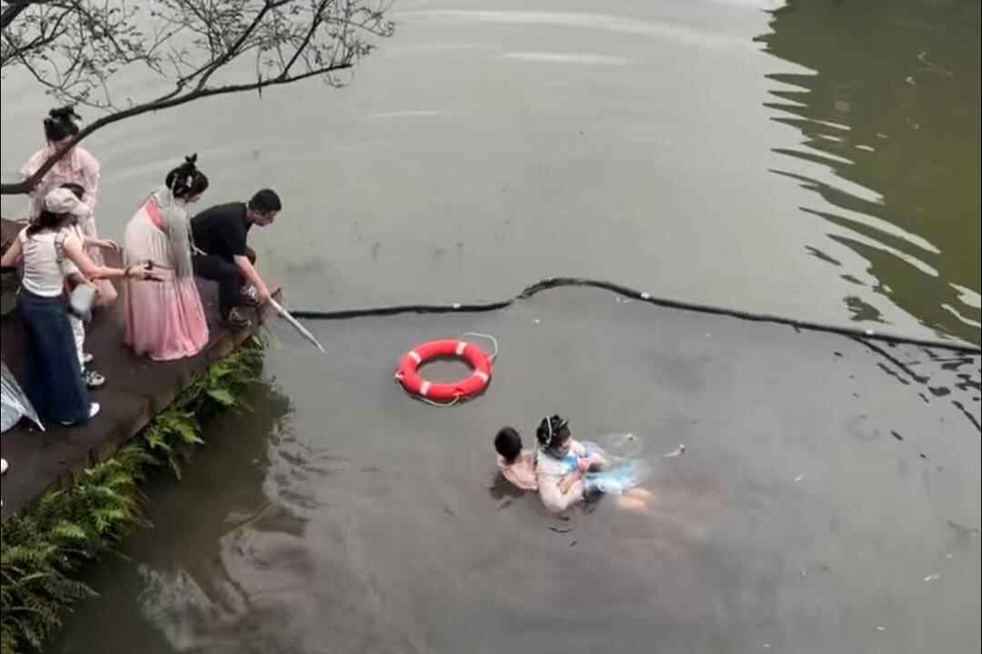 10月5日,网传有女性游客掉入李庄古镇水池中,随后有人扔来救生圈,一名青年男子来不及脱衣服下水营救。