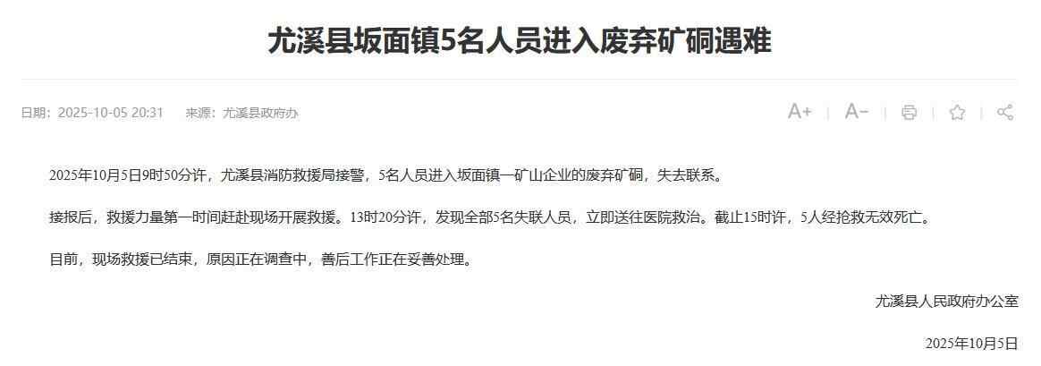 据福建省三明市尤溪县政府通报,10月5日,5名人员进入该县坂面镇一矿山企业的废弃矿硐后失联,救援力量迅速赶赴现场将5名失联人员救出,但5人经抢救无效死亡。