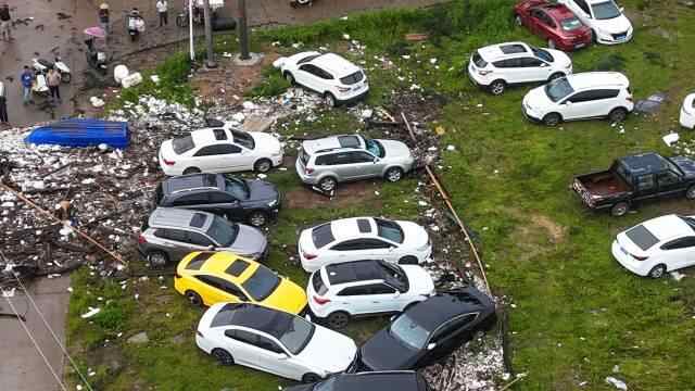 徐闻县和安镇土港码头(登陆点附近),码头驿站被吹破,海水倒灌后泡水的车辆。南方+拍客 张再漾 摄
