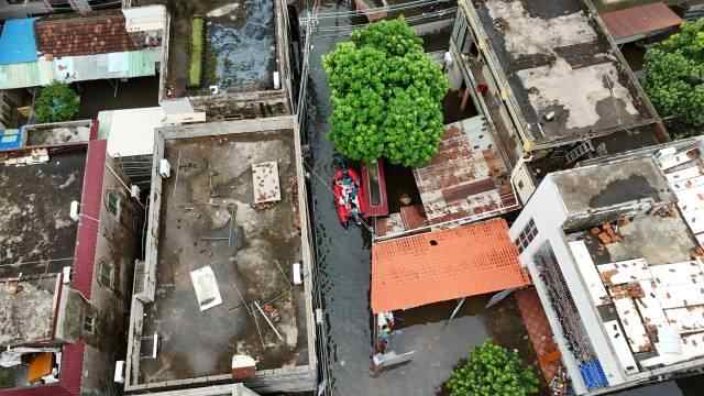 6日上午,徐闻徐城镇徐城街道育才路的积水仍有1米多深。湛江市蓝天救援队队员小心翼翼地走在齐胸高的积水中,拉着后方的皮划艇,皮划艇上坐着几位被救群众。
