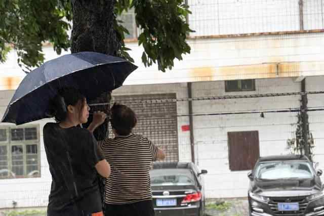 5日中午,风更强了。不少在外的居民在雨中赶路回家。记者站在临街的店铺门口,风声在耳边阵阵呼啸,豆大的雨点被风吹得倾斜,路旁的树枝树叶不断掉落。