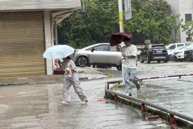 台风登陆前,遂溪县城路上的行人雨伞被吹变形。