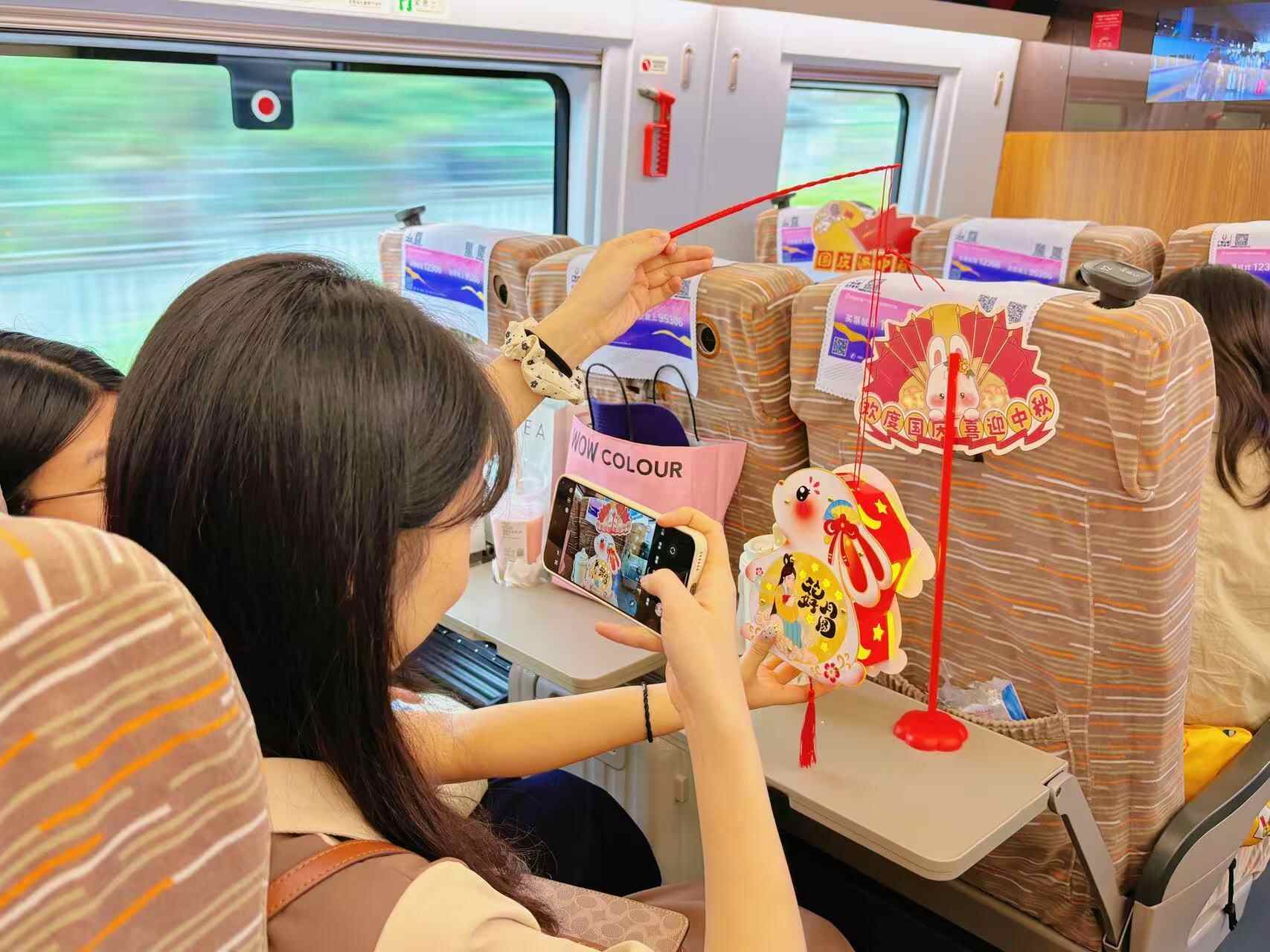 在保障运输顺畅的同时,铁路部门着力提升旅客的出行体验。广州客运段在G566次列车上精心策划了中秋主题活动。在车厢内悬挂彩色灯谜,张贴“中秋快乐”窗花与玉兔明月剪纸,节日氛围浓厚。列车长为旅客讲述中秋节的历史文化,组织以“团圆”为主题的诗词接龙和非遗花灯制作活动,旅客们积极参与。乘务员带领大家齐唱《明月几时有》,引发全场共鸣。活动最后乘务组为旅客送上了定制的中秋贺卡,让大家在旅途中感受到了浓浓的节日温情。