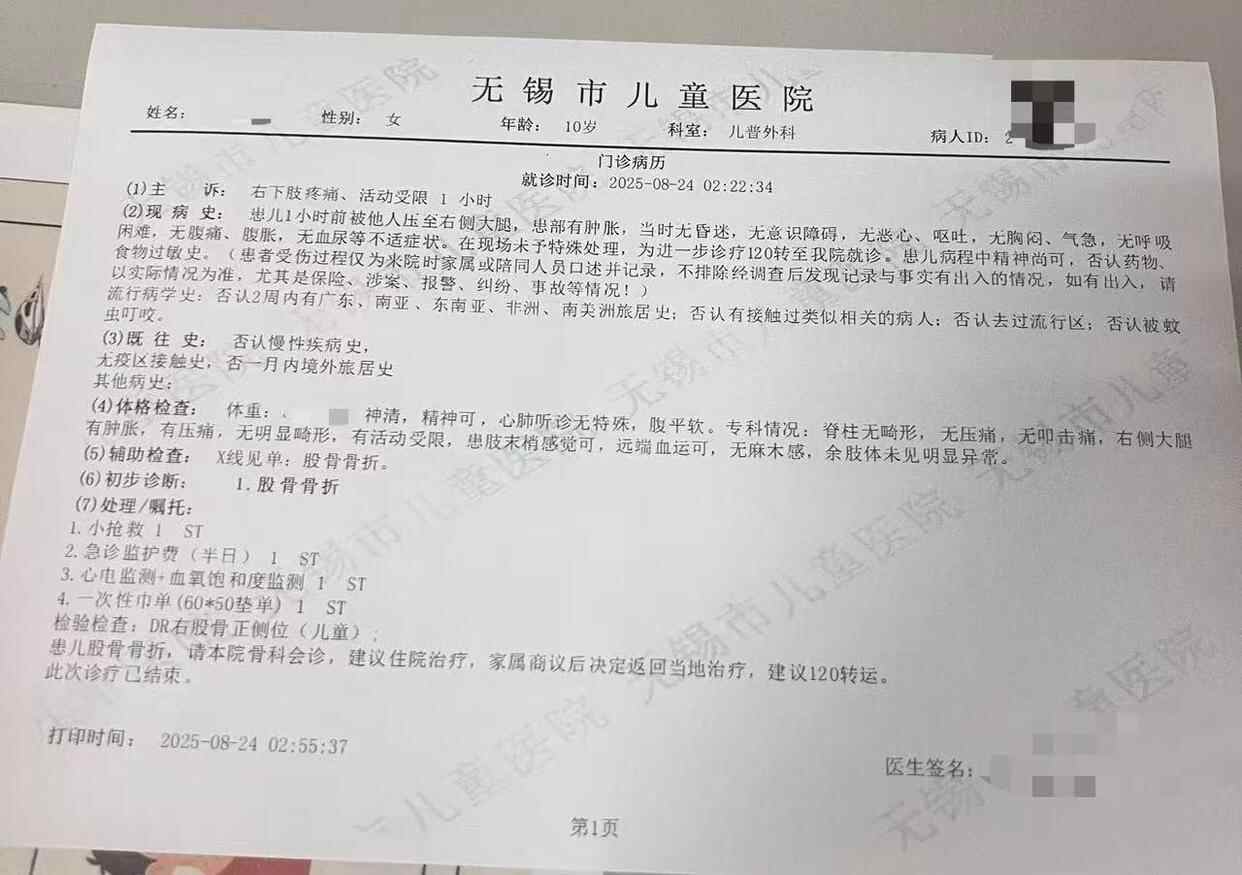 朱女士向记者出示的医院病历显示,8月24日凌晨,朱女士的女儿到医院就诊。医院诊断朱女士的女儿右股骨骨折,需要住院进一步治疗。