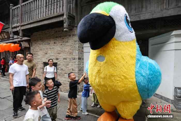 10月4日,乌江寨巨型“鹦鹉”人偶吸引游客。中新社记者 瞿宏伦 摄