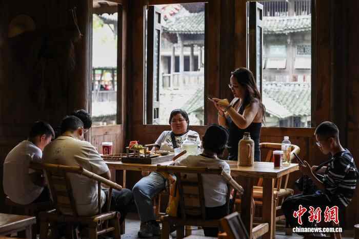 10月4日,游客在乌江寨一家茶馆喝下午茶。中新社记者 瞿宏伦 摄