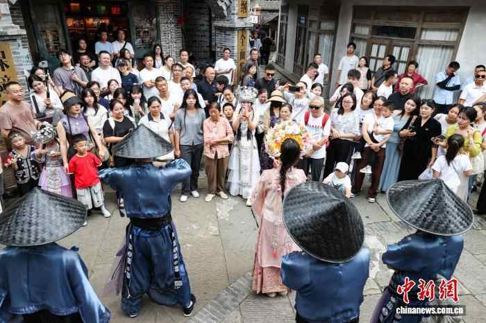 10月4日,乌江寨的演员和游客一起互动被围观。中新社记者 瞿宏伦 摄