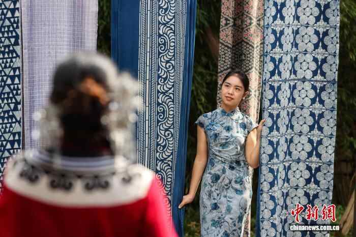 10月4日,游客穿着旗袍在乌江寨蜡染体验区拍照。中新社记者 瞿宏伦 摄