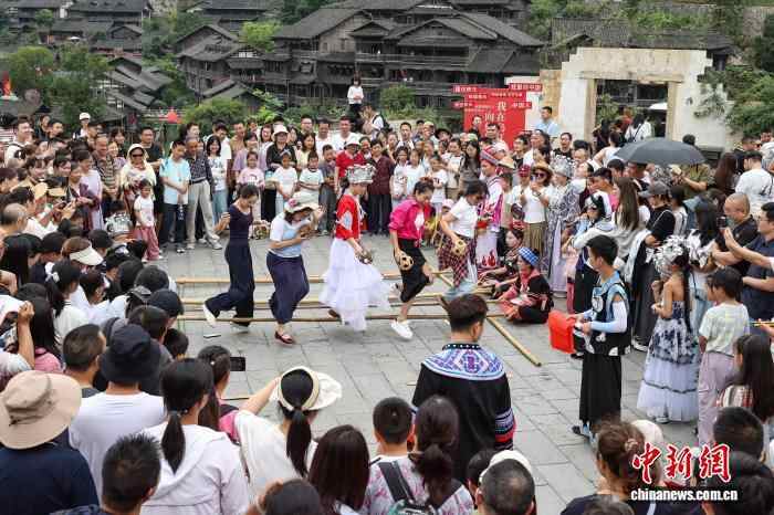 10月4日,游客在乌江寨体验竹竿舞和篾鸡蛋投掷。中新社记者 瞿宏伦 摄