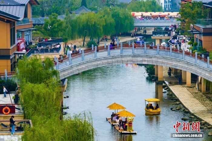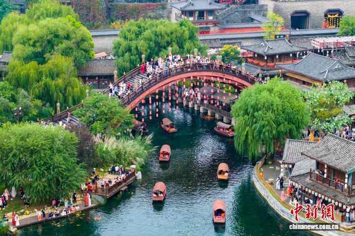 图为襄阳唐城影视基地,游客登上小桥看风景。(无人机照片)张倩龙 摄