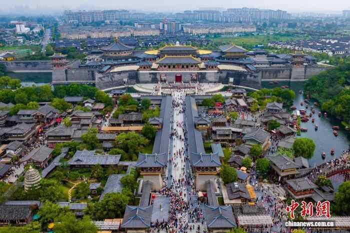 图为襄阳唐城影视基地游人如织。(无人机照片)张倩龙 摄