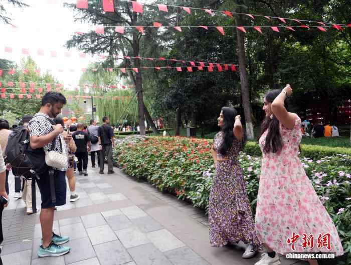 10月4日,四川成都,外国游客在成都人民公园拍照留念。中新社记者 安源 摄