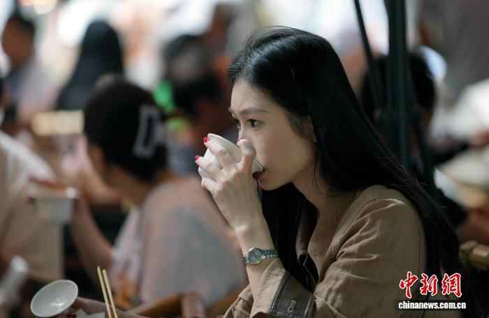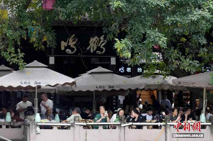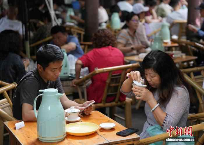 10月4日,四川成都,游客在成都人民公园鹤鸣茶社喝盖碗茶。中新社记者 安源 摄
