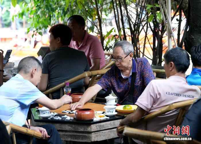 10月4日,四川成都,游客在成都人民公园鹤鸣茶社下围棋。中新社记者 安源 摄