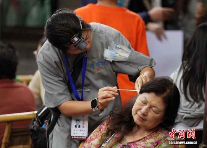 10月4日,四川成都,游客在成都人民公园体验采耳。中新社记者 安源 摄