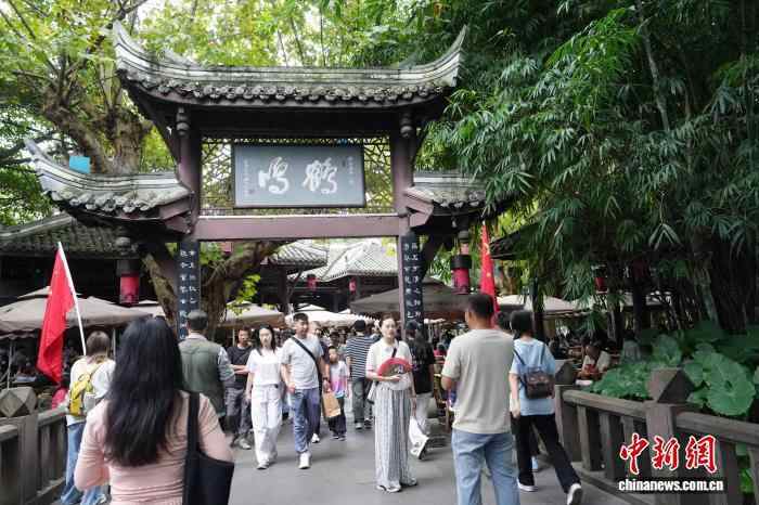 10月4日,四川成都,游客走进成都人民公园鹤鸣茶社。中新社记者 安源 摄