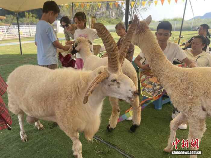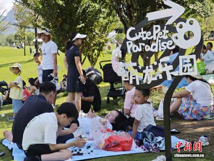 10月4日,游客在桂海晴岚景区的萌宠乐园旁游玩。周利朔 摄