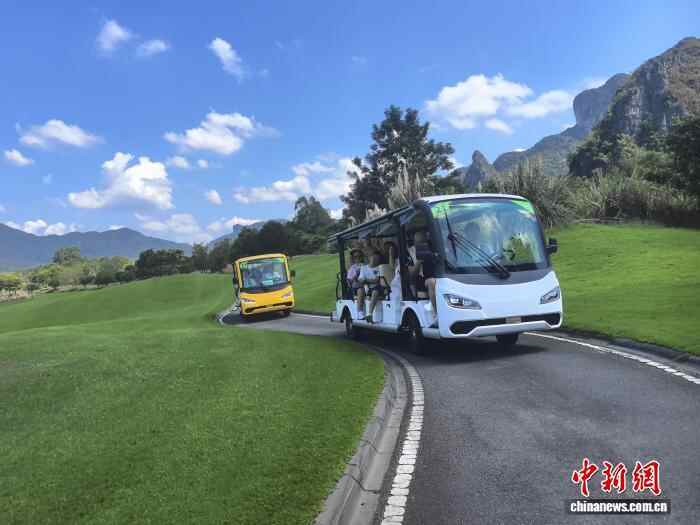 10月4日,游客乘坐游览车参观桂海晴岚景区。邓竣缤 摄