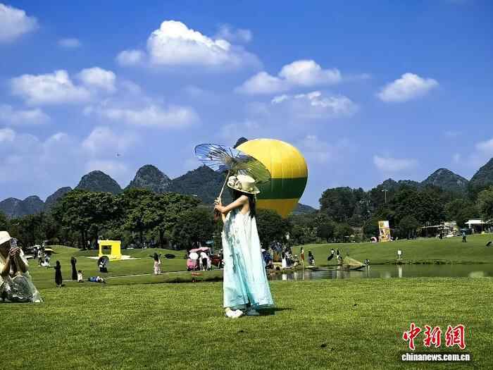 10月4日,游客在桂海晴岚景区与山水合影。邓竣缤 摄
