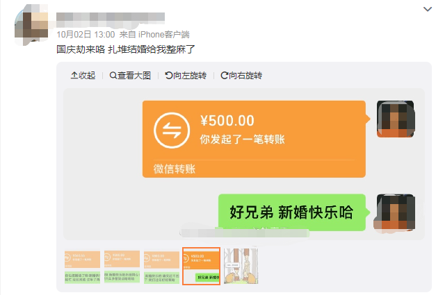 对于很多人来说,其实并不排斥参加婚礼沾沾喜气,只是随之而来的份子钱很让人心疼。尤其国庆结婚的人很多,来自四面八方密密麻麻的请帖,如同一颗颗红色炸弹,让人直呼伤不起。尤其在互联网时代,年轻人还会遇上很久没联系过的朋友突然发来的婚礼邀请,即使自己到不了现场,却还要思考是不是人不到礼要到。微博上很多网友都在大倒苦水,吐槽钱包被掏空。