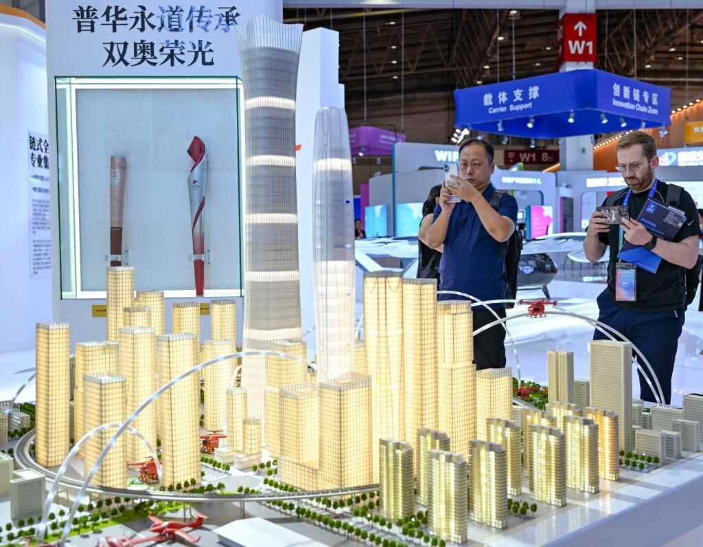 7月17日,观众在先进制造链展区普华永道展台展示的低空城市数智沙盘前拍摄。新华社记者陈朔摄