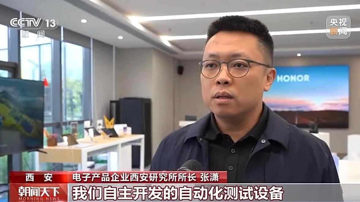 电子产品企业西安研究所所长 张潇:我们自主开发的自动化测试设备和仿生机械手,可以实现7×24小时无人化的测试,使得我们的产品质量和开发效率得到进一步提升,产品开发周期相比以前提升了30%。