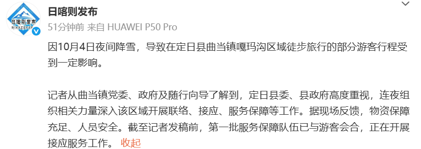 10月5日,@日喀则发布 发文回应“ 珠峰游客因暴雪被困 ”:
