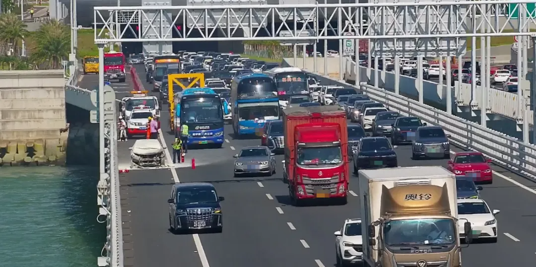 10月3日14时09分,深中通道路网调度中心监控员通过事件检测系统,发现一辆粤Q牌小车异常停靠在深圳往中山方向隧道出口处应急车道,车头冒烟,随即窜出明火并快速增大。