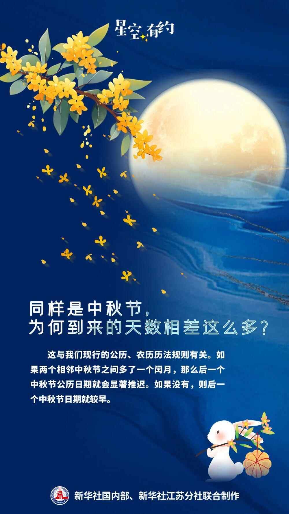 “中秋节对应的公历日期‘时早时晚’,与我们现行的公历、农历历法规则有关。”中国科学院紫金山天文台科普主管王科超解释说,我国传统的农历是一部兼顾了月亮圆缺变化周期和回归年长度的阴阳合历,一个朔望月平均约29.5天,一个农历平年为354或355天,平均比公历年(平年365天、闰年366天)少大约11天。